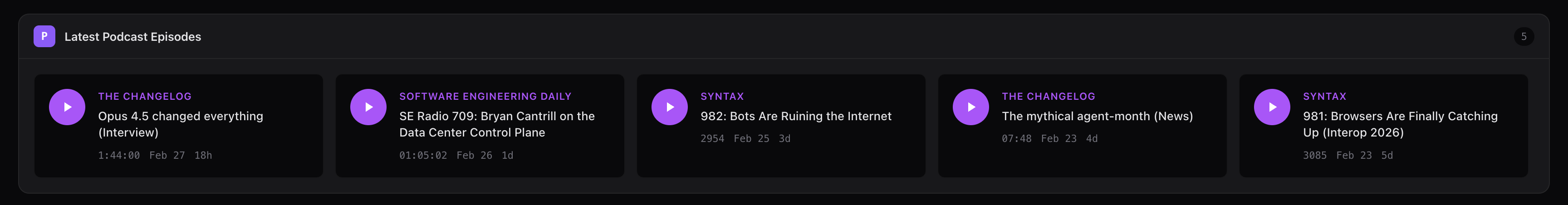 So I made podcasts a first-class citizen. They sit right at the top in their own section. The Changelog, Syntax, Practical AI, Software Engineering Daily. They’re all there. And you can add your own feeds.