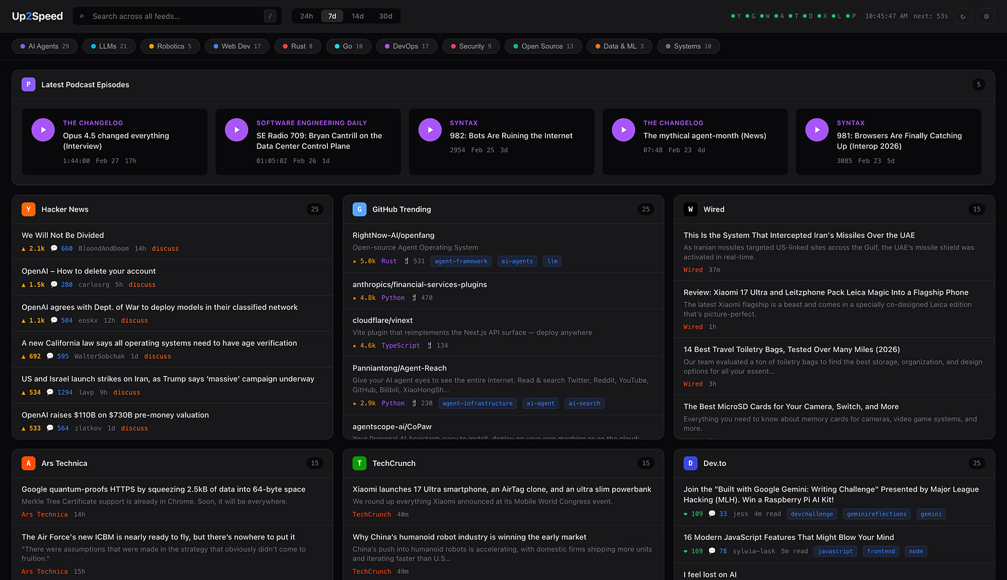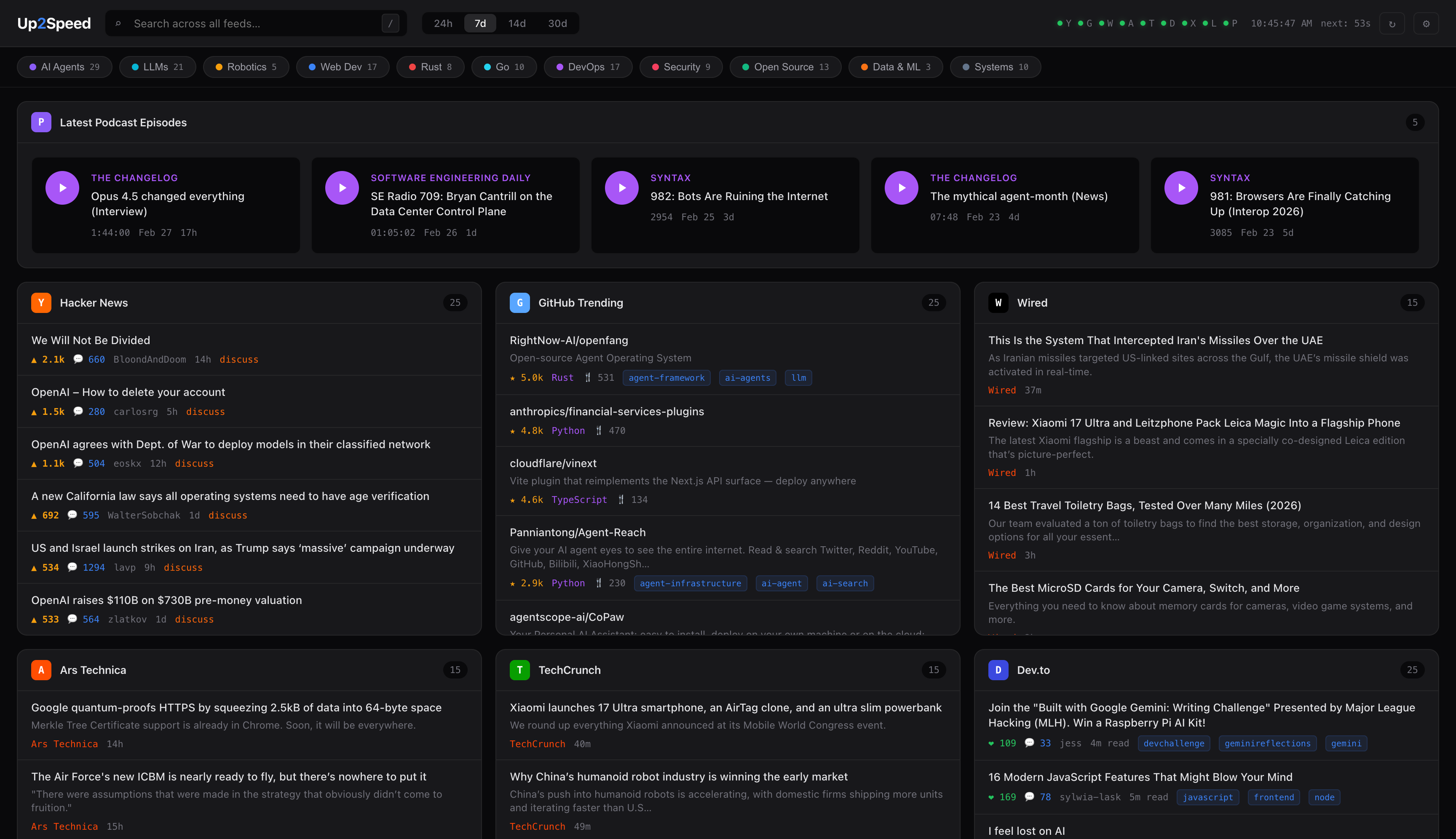 Up2Speed pulls from nine sources I actually care about. Hacker News, GitHub Trending, Dev.to, ArXiv papers, Lobsters, Wired, Ars Technica, TechCrunch, and podcasts. All in one dashboard. No more tab-hopping. And especially no more